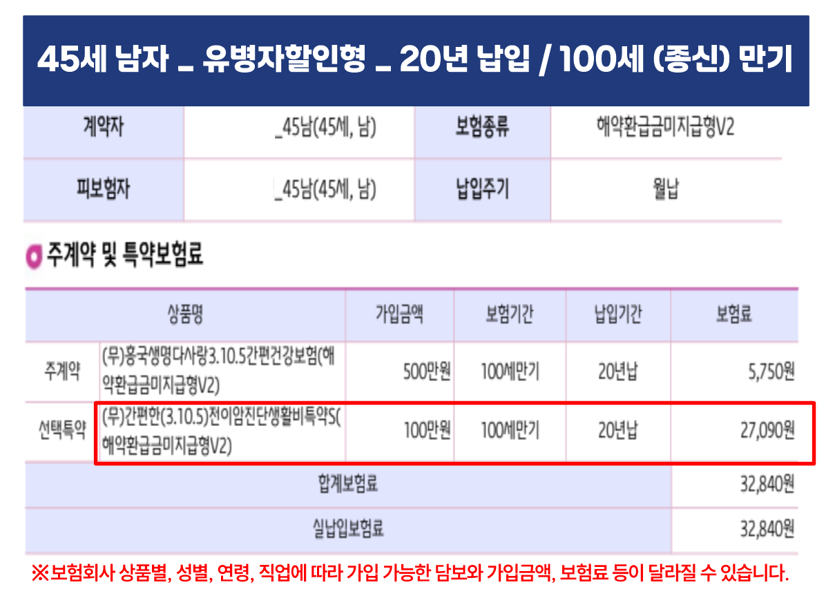 "유병자 할인형 / 1급 사무직 / 45세 남자 ”