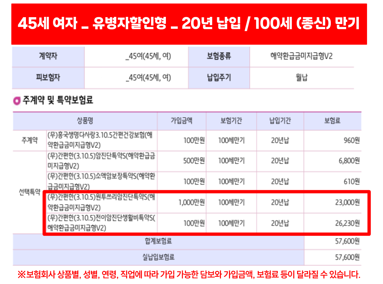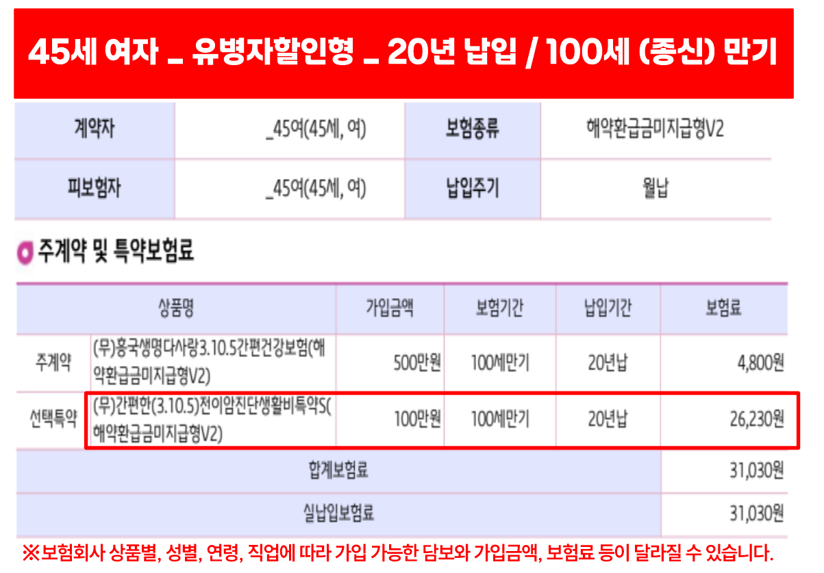 "유병자 할인형 / 1급 사무직 / 45세 여자 ”